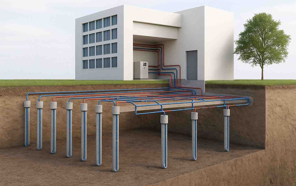 Le champ de sondes fonctionne ainsi comme une batterie thermique enterrée, capable de stocker et de restituer de l’énergie sur le long terme.
